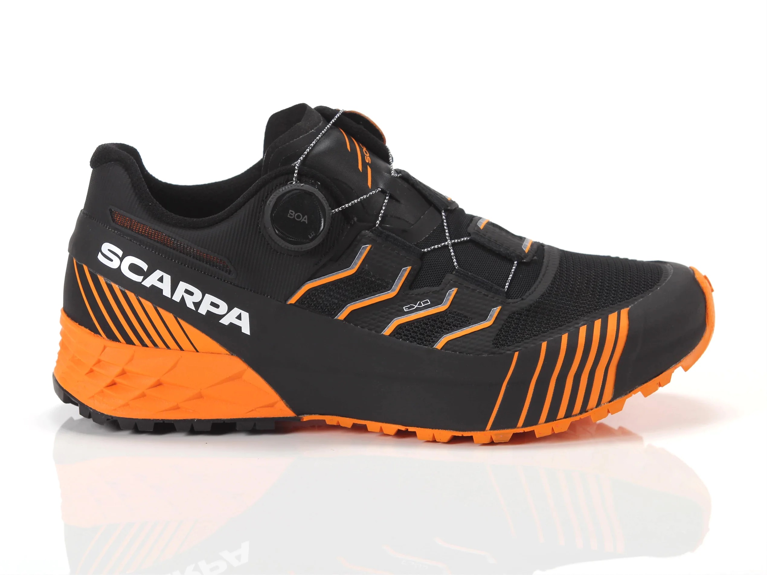 Mesh & microfiber fabric upper wraps round your foot like a sock thanks to the Sock-Fit LW construction system, avoiding pressure points and ensuring maximum comfort and precision fit. Protecting the ankle is the EXO SCARPA construction system. The heel is well stabilized by the iconic TPU band that completely wraps around the shoe.