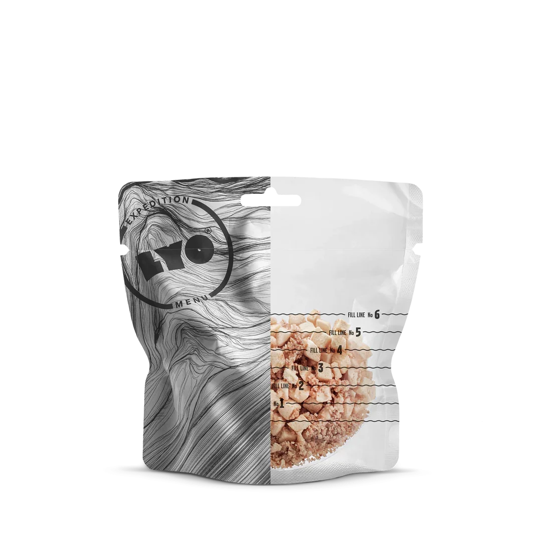 Лека и функционална опаковка: Опаковката е лека и удобна за приготвяне на LYO ястията директно вътре в нея.